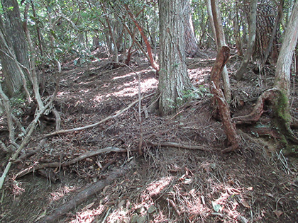 出ました。このあたりの山域ではおなじみのボブスレーのコースみたいな道です。カップアイスをスプーンでくーーっと削ったような凹んだ道です。高い場所にある踏み跡をたどります。いま思い出したけれど笹尾根の南面の支尾根にもボブスレーコースが多かったはず。