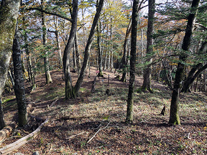 登山道を横切り、そのままあちらへ下ります。以前はトラロープが張られていたはずですが、見当たりません。