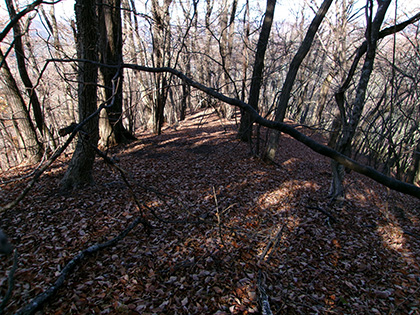 尾根と林道の段差が激しかった場所。640m圏です。写真右のほうに移動して林道に降りました。ここが林道と接した最後でした。