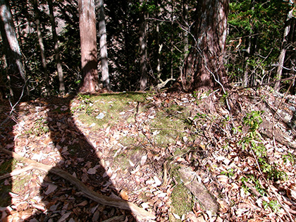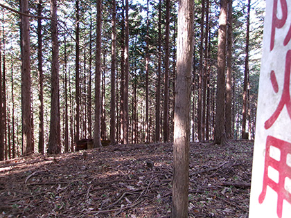 湯船の左上、石碑が建っていた場所です。流されたのか、周辺を探してみましたが見つかりませんでした。軍手をはずして湯船に貯まった水に手をつけたら「ちべた!」。残念。温かったら素っ裸になって入ってやろうと思っていたんですが、これは無理。水面はかすかに波打っています。風のせいなのか水が湧いているのかわかりません。においをかいでも無臭です。「湯場」の由来に立てたことで満足です。引き返します。