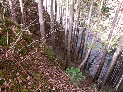 湯場ノ尾根の序盤は地形図にない林道がまとわりつきます。下るにつれ尾根は痩せ、冒険チックな様相が強まっていきました。