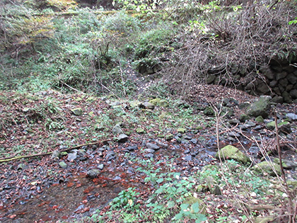 下っていくと宮の入沢との出合に出ました。対岸に林道茅ノ坂峠線が見えます。