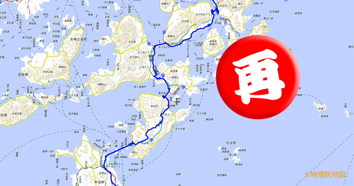 四国と本州、愛媛県と広島県のボーダーラインを越えます。