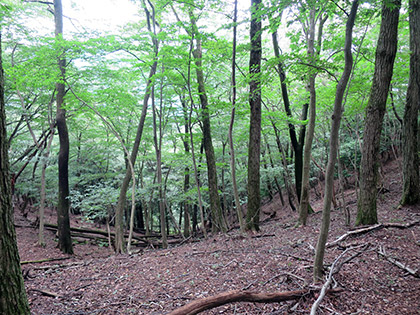 棒ノ折山から北東尾根を下りるのに苦労したのがそのとっかかり。棒ノ折山の山頂北面をあっちへうろうろこっちへうろうろ、微妙な踏み跡をことごとく進んでみたけれどどれもダメ。ホンゲ〜と思っていたところ、ふとひらめきました。降り口はもっと西じゃないの? まっ、尾根筋を追えば何となく西だろうというのはすぐわかることですけどね。まっ、それはそれこれはこれ。まっ、そんなことはともかく、北東尾根への降り口は山頂から都県境尾根の小径に入って20mほどの右側にありました。上の写真にはちゃんと写っていませんが太めの丸太で通せんぼがあり、木の枝には古びた赤い布が結ばれていました。ヤブの中に突っ込みます。