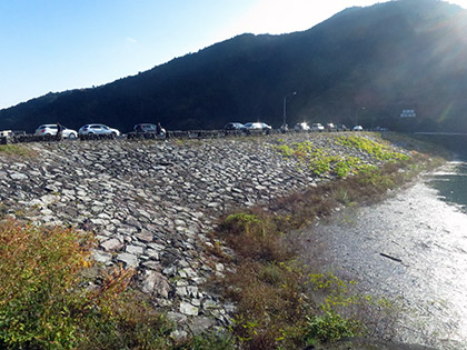 有間ダムの天端(てんば)に自動車やバイクがズラリと並んでいました。