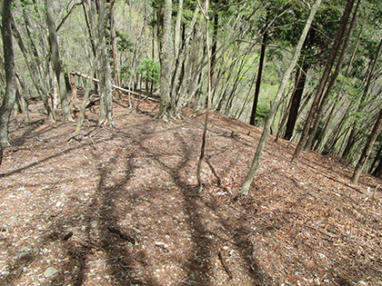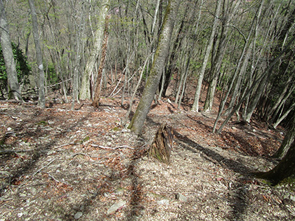 ヤセ尾根はまだ先に続いています。地形図からは読み取れない地形です。とは言っても頼れるものはほかになく、等高線の詰み具合からこの先は水根沢に向かって激しく切れ落ちている公算大です。また引き返します。