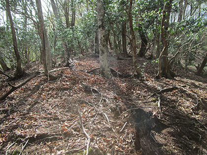 倉戸山(くらとやま)から東に下ってきた尾根を乗り越します。登る道はどこにいくのでしょうか。