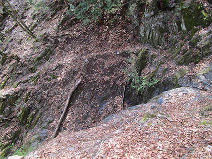 土砂が覆いかぶさって洞穴みたいになっている作業小屋を通過します。手前の沢は石で埋まっていましたがちいさな流れがありました。