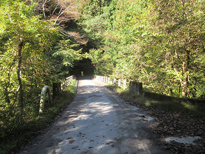 めざすガニ沢左岸尾根の下端です。そこそこデンジャラスな雰囲気ですが、なんとか取付けそうな気もします。けれども日原川を渡れません。下端からの取付は断念。 日原林道に上がって先に進んですぐ、孫惣谷(まごそだに まぐそだに)林道への橋を渡ります。