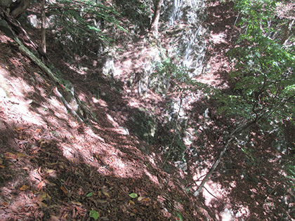 カツラの対岸にガニ沢が見えました。水の流れはありません。 めざすガニ沢左岸尾根の下端です。そこそこデンジャラスな雰囲気ですが、なんとか取付けそうな気もします。けれども日原川を渡れません。下端からの取付は断念。