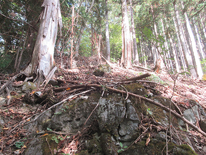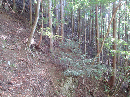 路肩がのっぺりした危ういトラバース(山腹水平移動)がつづいたり 古そうな石積が残ったしっかりしたトラバースになったりします。
