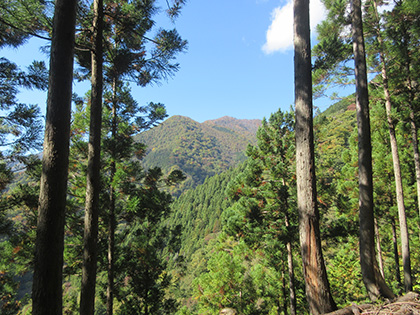 ガニ沢左岸尾根の下方。ぐぐぐーと下っていくとあのガニ沢出合です。 日原雲取道はノケ岩尾根に向かってつづきます。