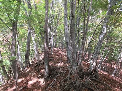ガニ沢尾根の前半は植林に囲まれた急登がつづいたんですか、ノケ岩尾根と合流した後半はブナやミズナラの雑木が覆い、緑の葉っぱと黄葉のはじまりの葉っぱがジグソーパズルみたいに組み合わさって、「ふへー」ってへんな感嘆の声が漏れたのでした。