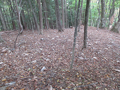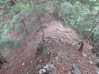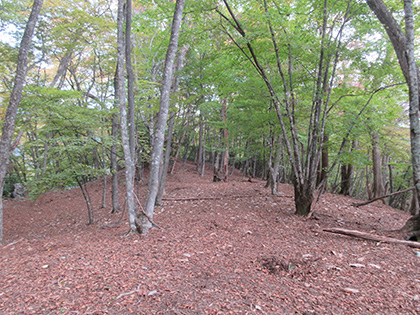 850m圏の鞍部で尾根を横切る小川谷上段歩道にぶつかりました。 振り返って。上段歩道は人形山東尾根の山腹をトラバースしていきます。