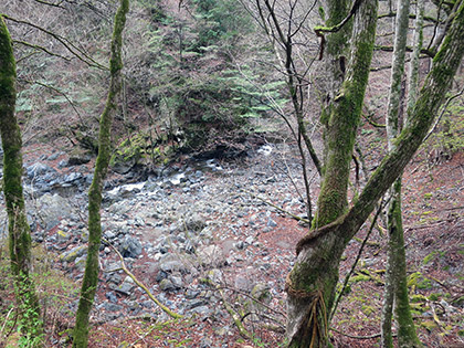 日向谷右岸尾根は取付にたどり着くまでが難儀。最初は三又(みまた)から酉谷の左岸を岩や倒木を乗り越えながらゴニョゴニョと歩き、やがて右岸の山肌に移ってグンと高度を上げた下げたりしながら上流へ上流へと踏み入っていきます。