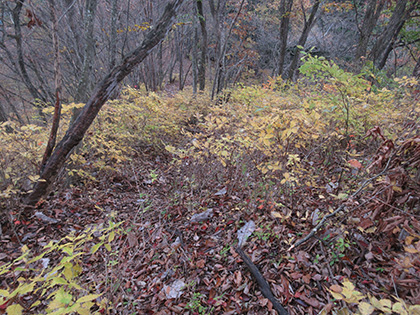 棒ノ嶺北東尾根の下降点です。かつては短い丸太の通せん坊が目印だったんですが、いまは丸太はぐんと長くなりおまけに下降点の両側の木に黄テープがぐるぐる巻き付けられていてマジックで「北東尾根」なんて書かれています。楽しみにしていた映画のオープニングを無理やり聞かされる気分です。古本屋で買った推理小説の途中に「犯人コイツ」って落書きがあるよりはマシか。