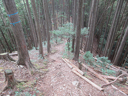 林道大名栗線に下るキツい急傾斜にロープが張られています。