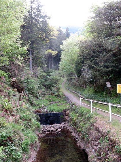 道中にあった「水小屋」(?)。谷川の水が何本かのホースでこの小屋に集められていて、太いパイプが下流に向かって右岸をクネクネ這っていた。