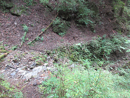 姥岩沢の右岸に作業道が下っています。中規模の分岐からシダロードを歩いてくるとここで登山道と合流します。