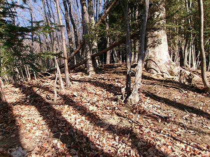 落ち葉を掃いた下は絵に描いたようなザレです。岩が細かく砕かれたのか土が小さく固まったのか、意識せずに足を載せるとチェーンスパイクを履いていてもズーーッて滑ってしまいます。数少ない立木や倒木を手がかかりに登ります。