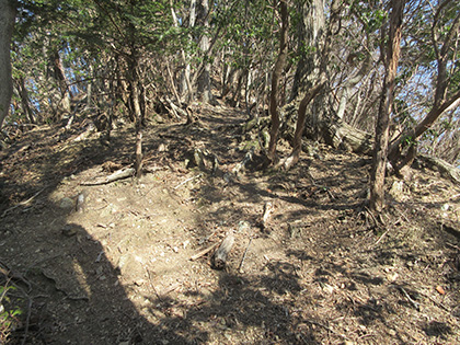 尾根を移りました。尾根を見上げます。720m圏の分岐は進行方向やや左でよかったんですが、すぐ右に下る分岐があったようです。どんまい!