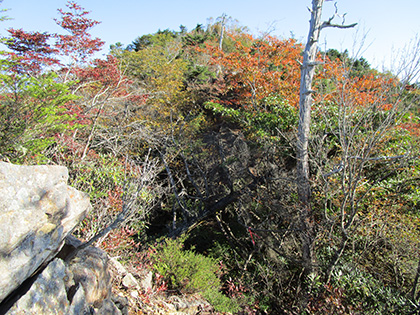 見上げると岩山のてっぺんに1本の木が見えました。前飛竜の前の岩山です。以前、勝手に飛竜前と名付けた岩山のピークですが、前前飛竜のほうが断然いいです。