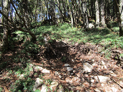 シャクナゲに覆われたこんな道を歩いているうちに前飛竜の山頂を通過していたようです。