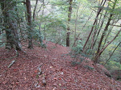 これは岩茸オキ尾根の下方。あのほぼ垂直な崖から大雲取谷に落ち込んでいます。想像するだけでちょっと怖いです。背を向け、登ります。