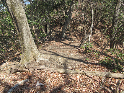 平坦な尾根を歩き、このあたりが地形図の破線(徒歩道)の端点です。なにかの印があるわけではありませんが、確かに道っぽいといえば道っぽいです。