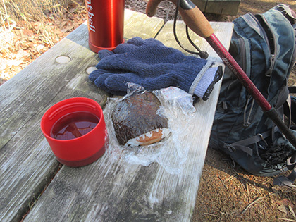 カリヨセタヌキは東屋の向こうに去って、カリヨセヒトはせんべい枕のようになったスパムのおにぎらずと水筒に詰めてきたほうじ茶を喫食します。