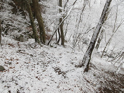 くの字くの字が終わると左右に日原川を見下ろせるヤセ尾根を歩いたりもします。このあたりから細かい雪が降ってきました。
