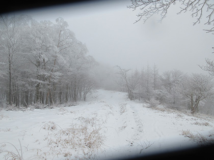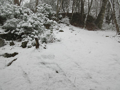 キリンボ尾根は雪で全貌がよく見えないこともあって巳ノ戸谷からいちばん傾斜のゆるそうな支尾根に取付きました。本尾根は急登の連続。雪は断続的に降り、チェーンスパイクは踏んだ雪を圧縮して固まり積み重なり、すぐにぽっくり下駄状態になるのでザックにしまいました。雪化粧の尾根はそれはそれで見応えがあるんですが、「素顔の君が見たい」などと思いながらルーツファインディング(登攀を支持する木の根を探ること)で軍手をドロビチャにしながら薄っすら汗をかいて激登は続くのでした。