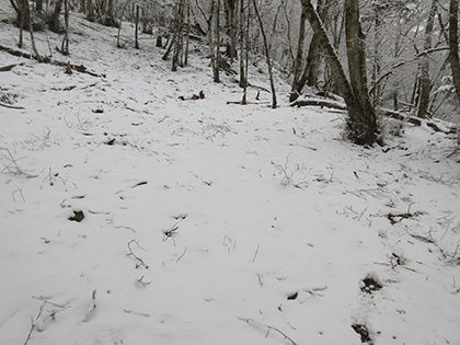 急登が続いています。写真を撮る余裕もなく、あえぎあえぎ登ります。見えている石はほとんど浮石で雪に軍手を突っ込んでかき回してのルーツファインディングはなかなかの苦行です。軍手に張り付いた雪はバンバンと柏手を打って弾き飛ばします。