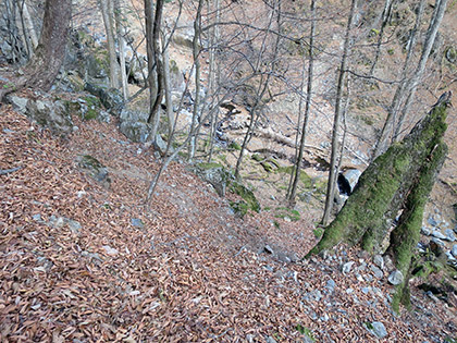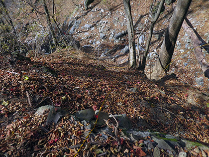前の写真の大木の向こう、倒木の手前まで登ってきました。右上に岩のすき間があります。