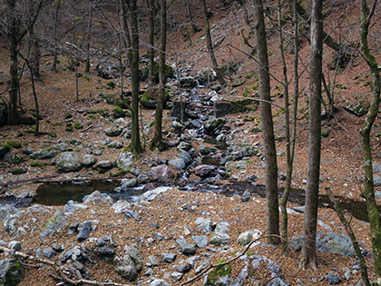 悪谷を渡ります。道はありません。歩きやすいところを探しながら岩に乗り倒木を越えていきます。