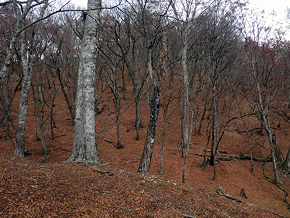 1300mあたりです。木の根がうねっていた場所から2、3分歩くと尾根相も林相もガラリと変わりました。