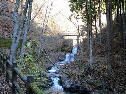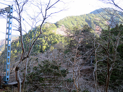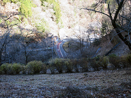 扉を出て左へ、水根沢谷の右岸を上流に向かいます。あの橋を渡り、車道まで階段を登ります。