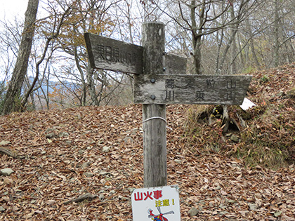 小屋前の道標。棒杭尾根に向かうべく、「蕎麦粒山 川乗山」方面へ進む。