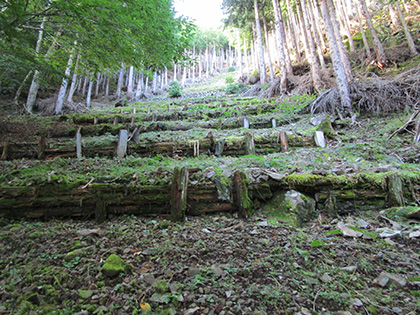 ですが、この桟道はいくら滑らなくても歩く気になれませんでした。横木が抜けているし山肌から離れて浮遊しています。しかも次の桟道と段差があります。短い距離ですが高巻きました。高巻きから桟道の上に降りるときが今回のルートでいちばん怖かったです。