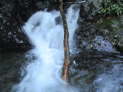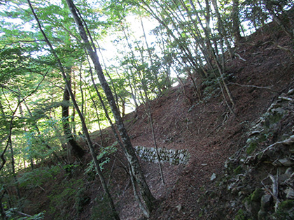 片倉谷巡視道は分岐がいくつもあります。テキトーに下っていったんですが、途中で完全に道を見失いました。小尾根をひたすら下り、なんとか巡視道に復帰できたんですがちょっと焦りました。くの字くの字と桟道のセットで片倉谷の右岸や左岸を心地よくときにデンジャラスにうねりながら下っていきます。