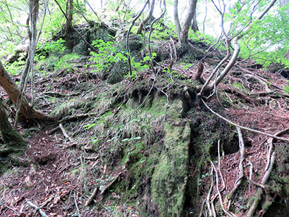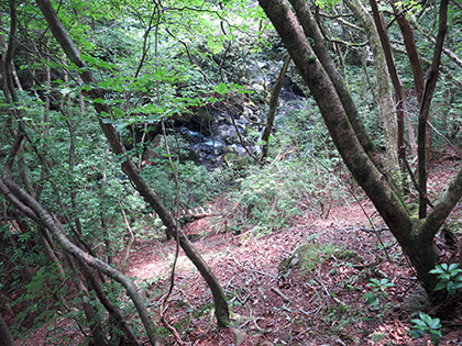 曲ヶ谷沢左岸尾根は川苔山(かわのりやま)のすぐ北東にあるヨウヘイギノ頭(曲ヶ谷ノ峰?)をてっぺんにして、曲ヶ谷沢の左岸を曲ヶ谷沢と大丹波川(おおたばがわ)の出合いに落ち込んでいる尾根です。まさに「落ち込んでいる」感じで、下調べはしていたものの現場を見ると「ココ登んの?」とその崖っぷりにかなりビビりました。急登は終盤近くまでずっと続き、久々のキツい尾根歩きになりました。テープ類は4、5カ所見かけましたが、登りで道迷いするような場所はなかったように思います。