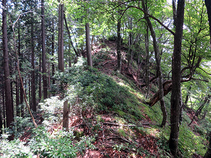 そういえば、鉄塔を過ぎたあたりから道はしっかりしてきました。こんな立派な巻き道もあります。バテてはいますが、気力を奮い立たせて尾根に取り付きます。