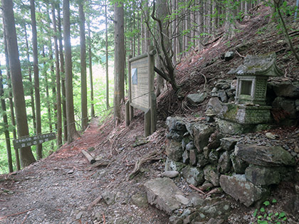 途中にあった看板。「登り口 将門神社 御幸姫観音 三面不動尊 縁結び山の神」と書かれています。「御幸姫観音」と「縁結び山の神」は気付きませんでした