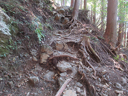 下山は峰集落跡から『バリエーションハイキング』(松浦隆康 新ハイキング社 2012)で「難路」として紹介されている入川谷右岸の中腹道をたどって青梅街道の古里附橋(こりつきばし)近くの車道に降りました。