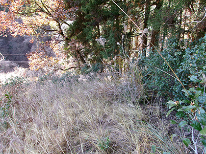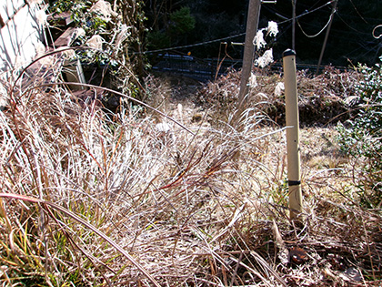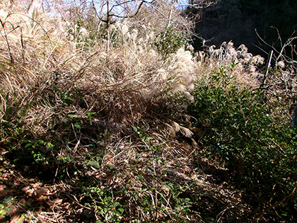 垣根の向こうはススキの原っぱ。どう進んでいいのかわからなくなって右手の植林の中へ逃げ込みます。