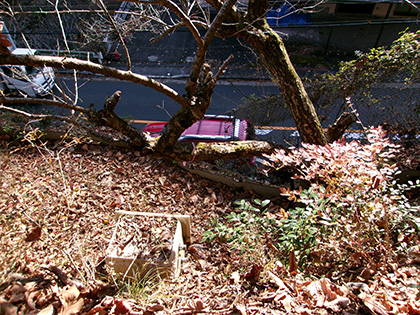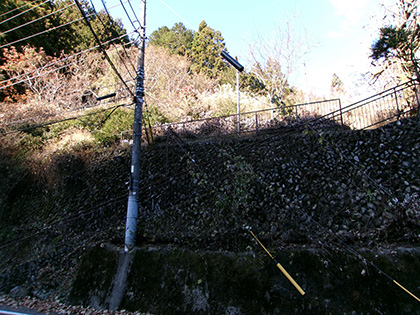ダイコン沢左岸尾根の檜原街道への下降にはとまどいました。へんなルートで里に降りるときにはありがちなんですが、道はあるけれど民家の庭先に通じているんじゃないの? みたいな。今回は民家の屋根を見下ろしながらススキの原っぱをゴニョゴニョとさまよった挙げ句、幸いなことに空き家と草ボーボーの空き地の先にようやく檜原街道へ降りる階段を見つけることができました。