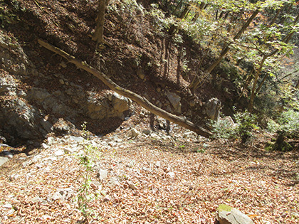 のっぺり斜面をクリアするとすぐにロープの張られた崩落地です。敷居よりずっと狭い畳の縁みたいな道があるはずなんですが落ち葉が積もっていてただの崖にしか見えません。杖をザックに入れたままだったので足で落ち葉を払いながら足場を探り探りの前進です。