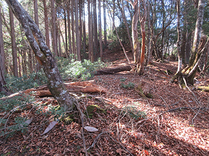 道? みたいな道にぶつかりました。このあたりは幅広の尾根なのでテキトーに登れます。面白そうなのでたどってみます。