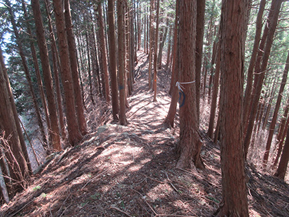 尾根の下端が近づくと傾斜がキツくなってきました。人様んちの屋根が見えています。水の音も聞こえます。350mあたりです。