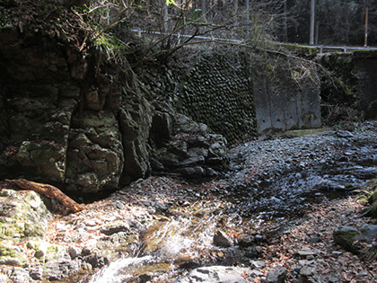 擁壁に貼り付いた階段のような崖のような岩のでこぼこを這い上がり、